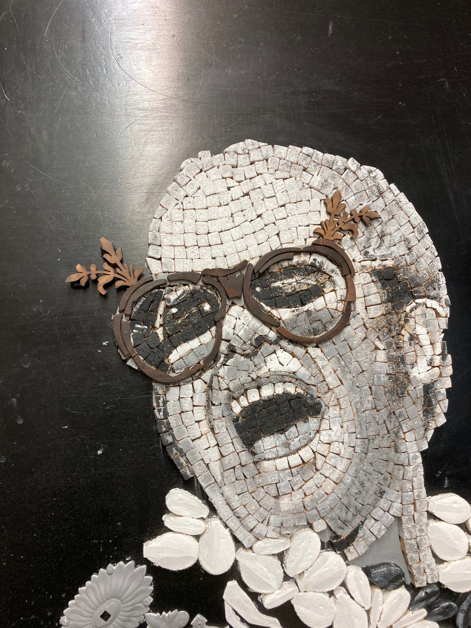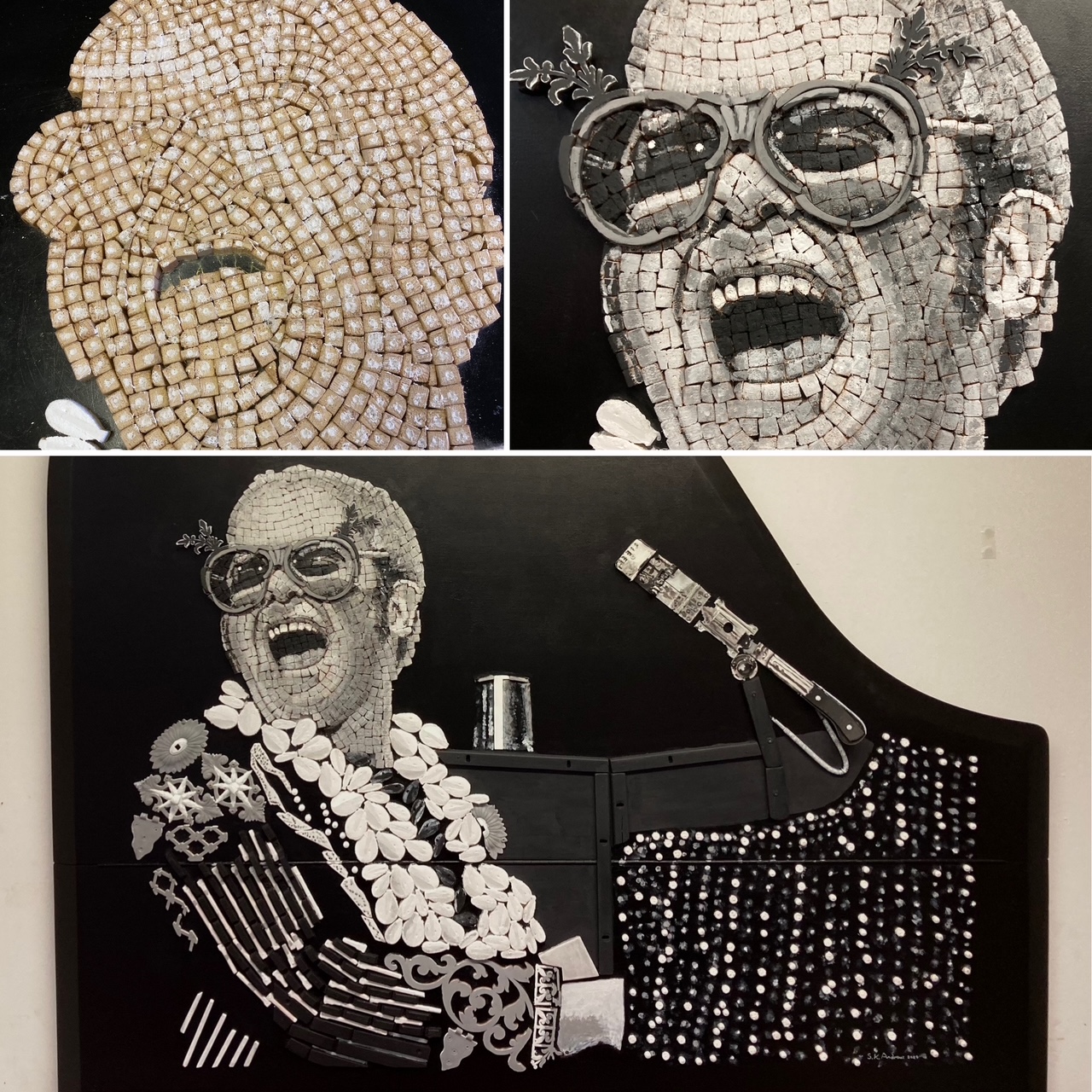 My vision for the face as a mosaic came to life as I handcut over 800 (1cm) cube blocks from the piano keys.