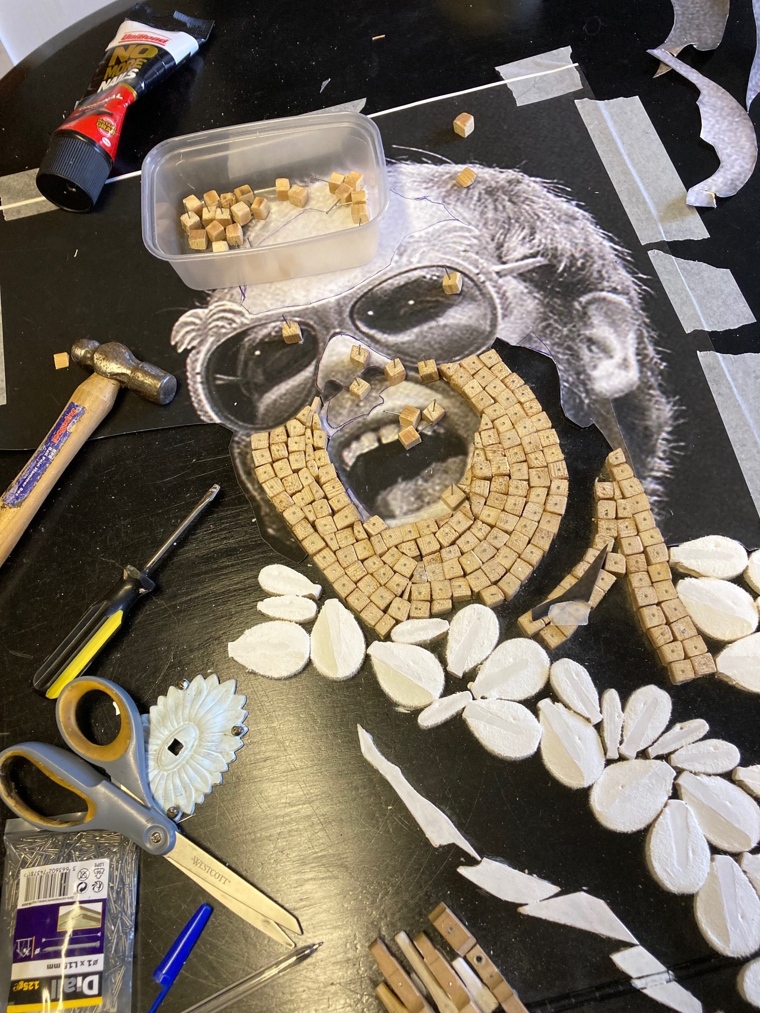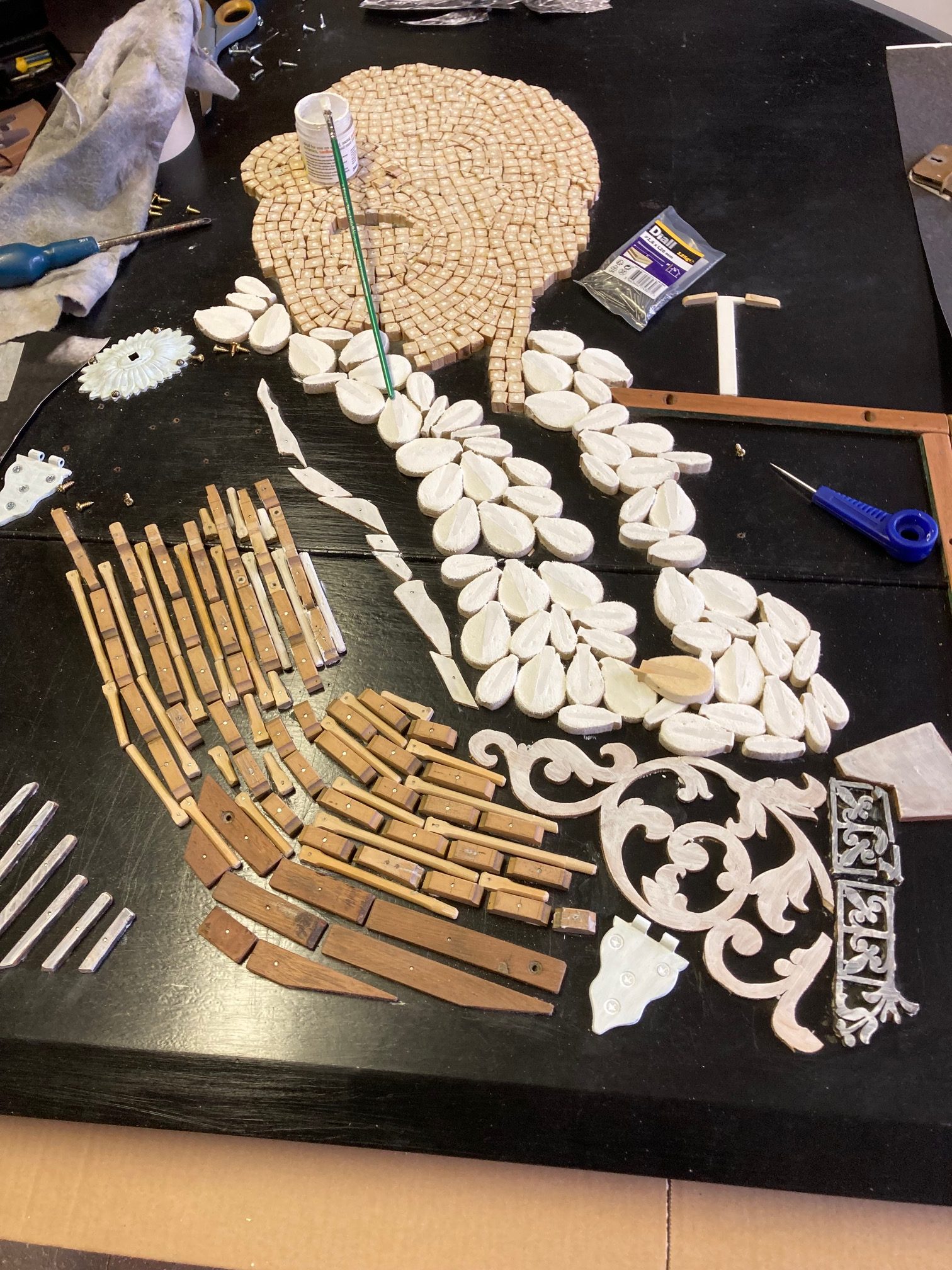 Fixing them to the Baby Grand Piano ‘canvas’ with glue and panel pins, then individually punching in the pins, filling and painting.