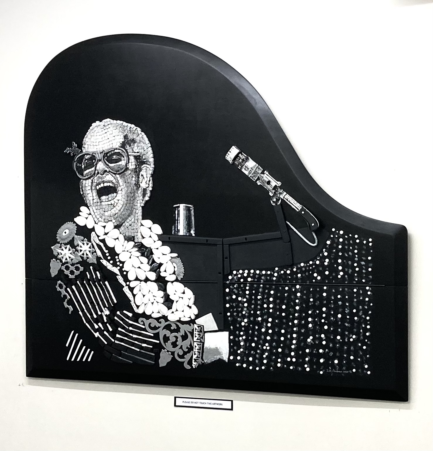 Medium: Created from 100% recycled and reworked piano parts.